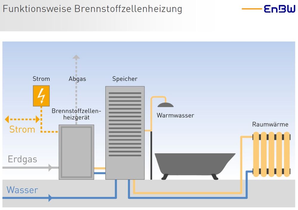 Voraussetzung für den Einbau einer Brennstoffzellen-Heizung ist ein Erdgas-Anschluss im Gebäude. Der von der Zelle produzierte Strom kann den Bedarf in einem durchschnittlichen Haushalt zu einem grossen Teil abdecken. Als «Nebenprodukt» der Stromgewinnung entsteht Wärme, die für Heizung und Warmwasser genutzt werden kann. Steigt der Bedarf an Wärme oder Warmwasser im Gebäude kurzfristig an, wird die integrierte Gas-Brennwert-Zusatzheizung zugeschaltet. Trotz hohem Wirkungsgrad ist diese Technik daher von einer fossilen Energie abhängig. In Zukunft könnte sich dies aus zwei Gründen in der Schweiz ändern. Erstens steigt der Anteil Biogas im Erdgasnetz, es kann also CO2-neutrales Methan für die Wasserstoff-Gewinnung bezogen werden. Zweitens dürfte künftig synthetisches Methan, das aus überschüssigem erneuerbarem Strom hergestellt wird, zur Verfügung stehen.
