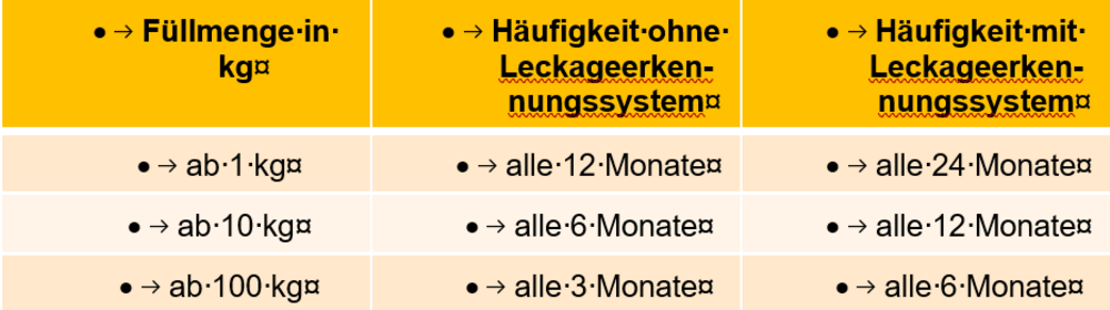 Betreiber von Kälte- und Klimaanlagen sind nach alter und neuer F-Gase-Verordnung verpflichtet, grösste Sorgfalt walten zu lassen, was die Dichtheit der Anlagen betrifft. Leckagen müssen umgehend behoben werden, was nicht nur aus Gründen des Klimaschutzes erforderlich ist, sondern auch weil die Leistung und Energieeffizienz ansonsten sinken. Die Anforderungen und Intervalle (abhängig von den Kältemittelfüllmengen) für Dichtheitskontrollen bleiben bestehen, wie in der bisherigen F-Gase-Verordnung beschrieben. Neu ist jedoch, dass auch Anlagen mit Kältemitteln in Annex II (Teil 1) der F-Gase-Verordnung – das sind die HFO-Kältemittel wie z.B. R1234yf oder R1234ze – künftig auf Dichtheit kontrolliert werden müssen, wenn sie mehr als 1 kg Füllmenge enthalten. Es gelten folgende Vorgaben für die Intervalle bei HFO-Kältemitteln: