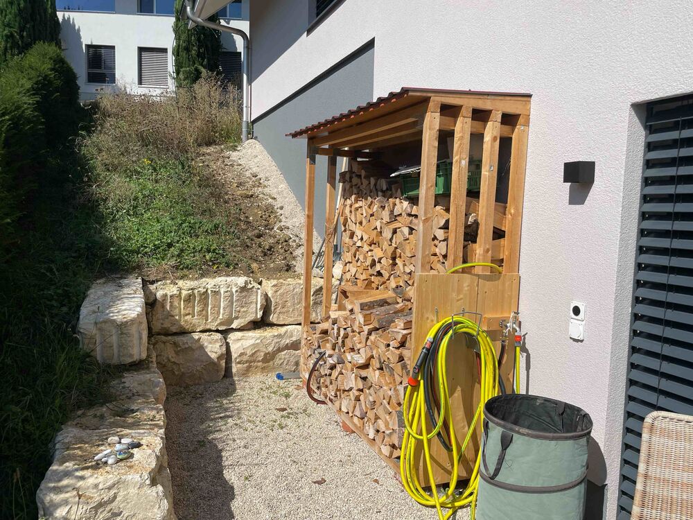 Der gesamte Holzbedarf für den ersten Winter liegt bei etwa 3 ½ Ster. Darin enthalten ist auch das Holz für den zweiten, nicht an den Speicher angeschlossenen Ofen im Obergeschoss, sowie etwas Holz für die Feuerschale. Die beiden Holzlager, eines für den Ofen im Erdgeschoss, eines für denjenigen im Obergeschoss, bieten Platz für etwa 4 Ster Holz. Das Holz muss witterungsgeschützt und idealerweise südseitig gelagert werden. Auch auf eine ausreichende natürliche Belüftung des Holzlagers ist zu achten. Das Feuerholz sollte mindestens 2 Jahre getrocknet und etwa faustdick gespalten sein. Harthölzer haben gegenüber Weichhölzern einen um etwa 30% höheren Heizwert.