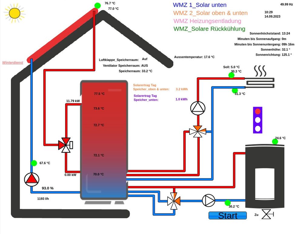 Etwa drei Viertel des für Heizung und Trinkwarmwasser benötigten Wärmebedarfs entfallen in einem sehr gut wärmegedämmten Wohnhaus auf das Winterhalbjahr. In einem schlecht gedämmten Gebäude liegt der anteilige Wärmebedarf im Winterhalbjahr sogar noch deutlich höher. Im Sommerhalbjahr wird also nur ein Viertel der Wärme benötigt, es fallen jedoch etwa 2/3 der Solarenergie an. Selbst mit unserem grossen und aktuell auf fast 90°C geheizten Speicher können wir die jetzt im Sommer anfallende Sonnenenergie nicht mehr vollständig einspeichern. Die Überschusswärme wird in der Nacht wieder über die Kollektoren abgestrahlt und der Speicher so wieder abgekühlt.