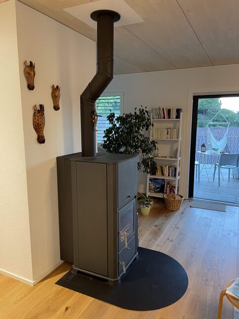 Auch die Zusatzheizung war für uns von Anfang an klar: wir wollten eine Stückholz-Heizung. Dabei ist dies keine «Pflicht» im Sonnenhaus. Das Konzept lässt sich auch sehr gut mit einer Wärmepumpe oder einem Pelletskessel kombinieren. Ist der Zusatzwärmeerzeuger beispielsweise eine Wärmepumpe mit Erdsonden, kann die solare Überschusswärme im Sommer anstatt über das Dach in die Sonde abgeführt werden. Dies kann die ohnehin schon hohe Effizienz der Wärmepumpe nochmals deutlich verbessern. Es ginge sogar ganz ohne Zusatzheizung! Mehrere, teilweise seit Jahrzehnten betriebene, Sonnenhäuser nutzen ausschliesslich Solarwärme für Raumheizung und Trinkwarmwasser. Dann allerdings mit nochmals deutlich grösserer Kollektorfläche und grösserem Speichervolumen.
