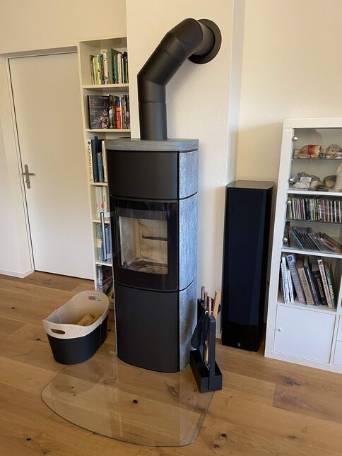 Ende November ist es dann so weit: Der Speicher ist zwar noch immer genügend hoch beladen, um das Haus mit Wärmeenergie für die Heizung und das Trinkwarmwasser zu versorgen, aber nicht mehr auf ganz so hoher Temperatur wie noch vor einem Monat. Nun können wird das erste Anfeuern angehen. Weil es dabei einiges zu beachten gilt, erfolgt die Inbetriebnahme vor allem des Ofens mit Heizwasser-Register zusammen mit Lukas Meister von der gleichnamigen Firma für Erneuerbare Energietechnik, dem Lieferanten und Ersteller der Solaranlage und der grösseren Stückholzheizung im Erdgeschoss.